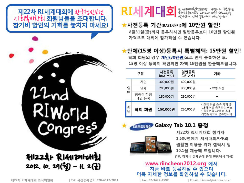 RI 세계대회는 장애인의 공동 의제에 대한 대안과 실천전략을 모색하기 위해 4년마다 열리는 국제학술대회입니다. 대회 홈페이지(www.riincheon2012.org)를 통해 등록 하실수 있습니다.