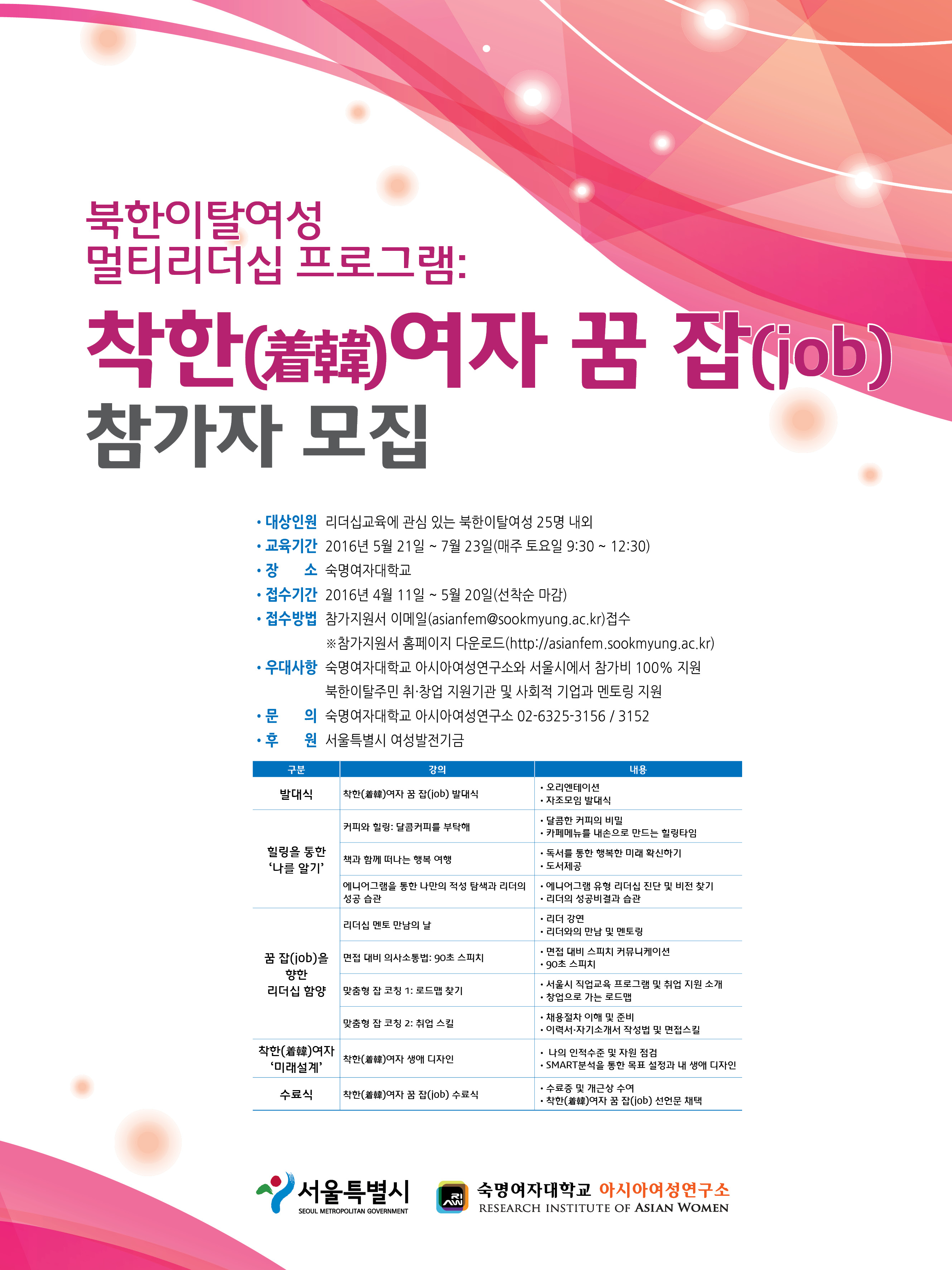 북한이탈여성 멀티리더십 프로그램: 착한(着韓)여자 꿈 잡(job) 참가자를 모집합니다!