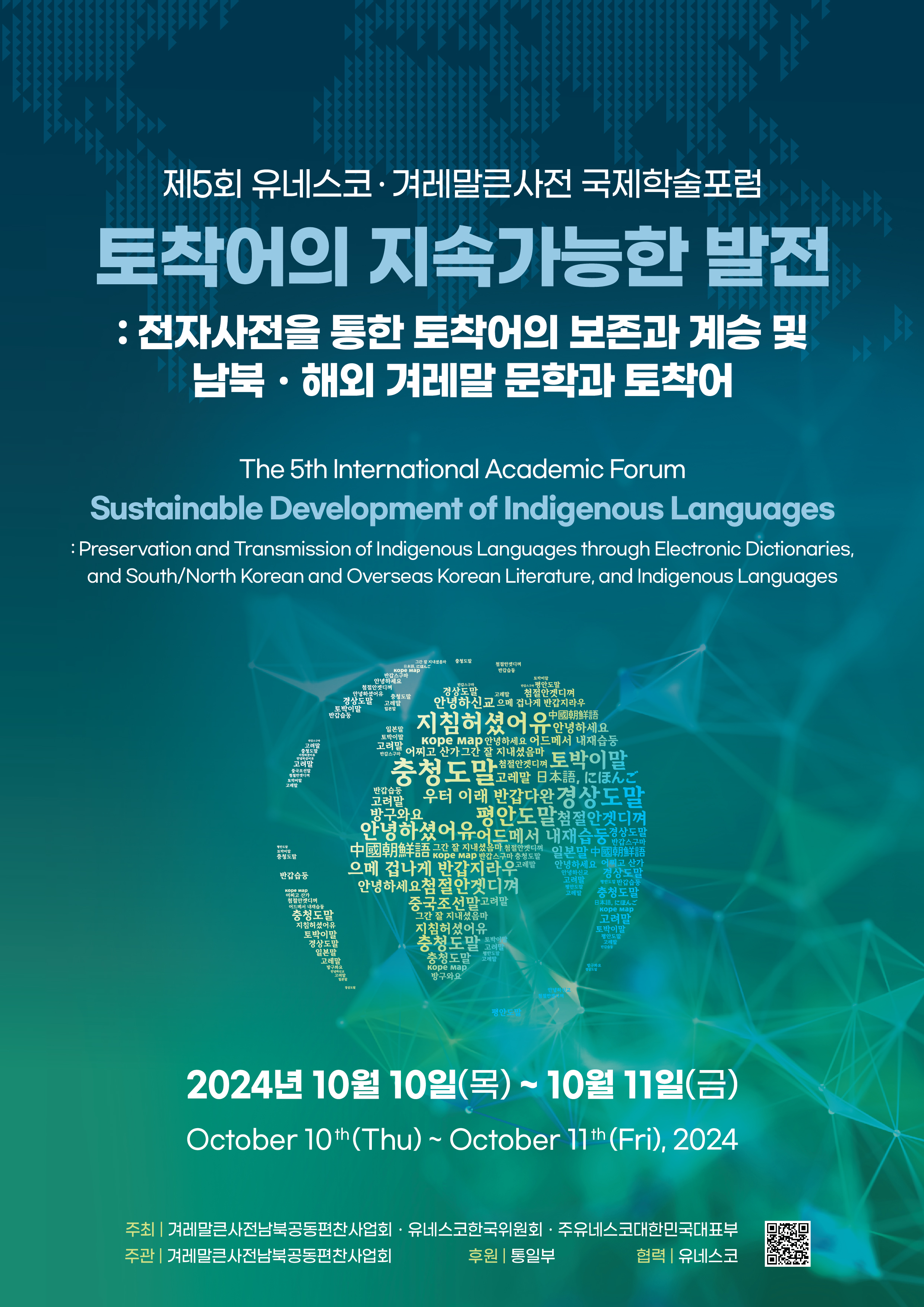 남북 공동으로 《겨레말큰사전》 편찬을 추진하고 있는 겨레말큰사전남북공동편찬사업회(이사장 민현식)에서 한글날을 맞아 제5회 유네스코·겨레말큰사전 국제학술포럼 <토착어의 지속가능한 발전>을 개최합니다.