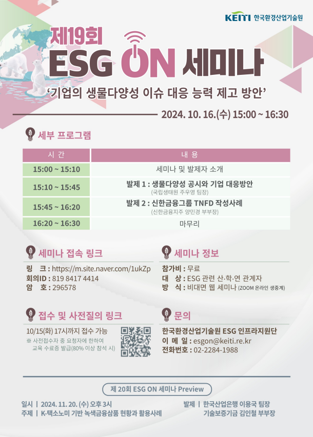 '24.10월은 '기업의 생물다양성 이슈 대응 능력 제고 방안'을 주제로 제19회 ESG ON 세미나를 개최합니다.