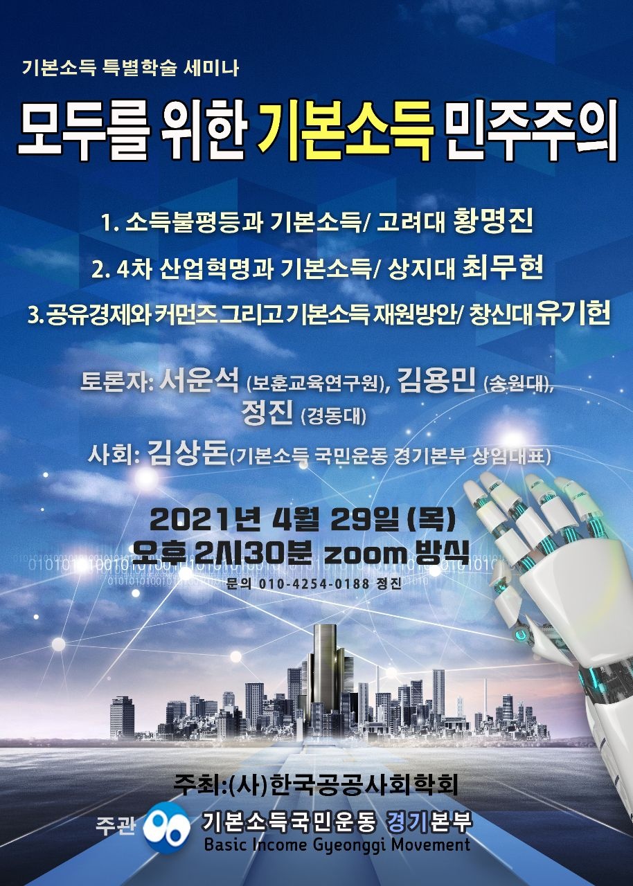 (사)한국공공사회학회와 기본소득 국민운동경기본부는 2021년 4월 29일(목) '모두를 위한 기본소득 민주주주의' 주제로, 특별 학술세미나를 개최합니다. 이번 학술세미나에서는 기본소득의 필요성과 재원마련방안에 대해 성찰하고 소통, 공감할 수 있는 자리에 부디 참석하셔서 여러분의 소중한 제언과 훌륭한 고견을 나눠주시기를 바랍니다.
