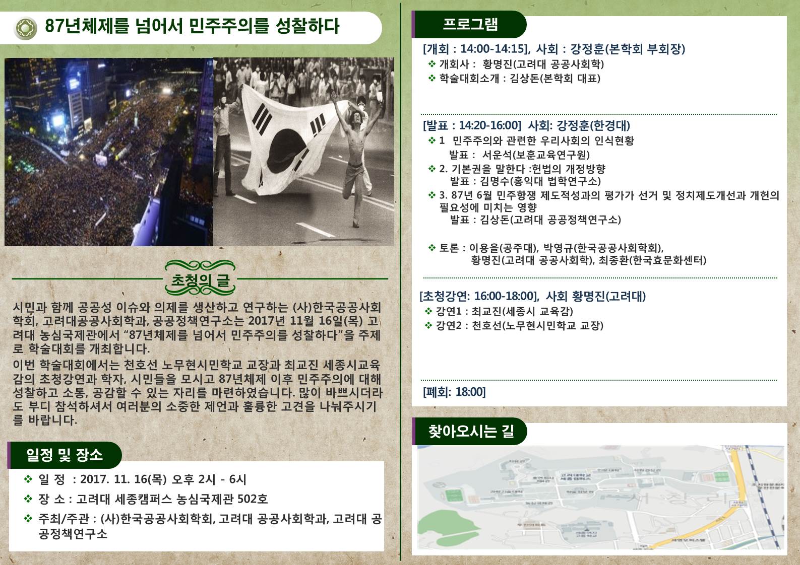 사단법인 한국공공사회학회와 고려대 공공사회학과, 고려대 공공정책연구소는 20171116() 고려대 세종캠퍼스에서 “87년체제를 넘어서 민주주의를 성찰하다주제로 추계학술대회를 개최합니다. 바쁘시더라도 부디 참석하셔서 여러분의 소중한 경험과 지식을 함께 나눠주시기를 부탁드립니다.
