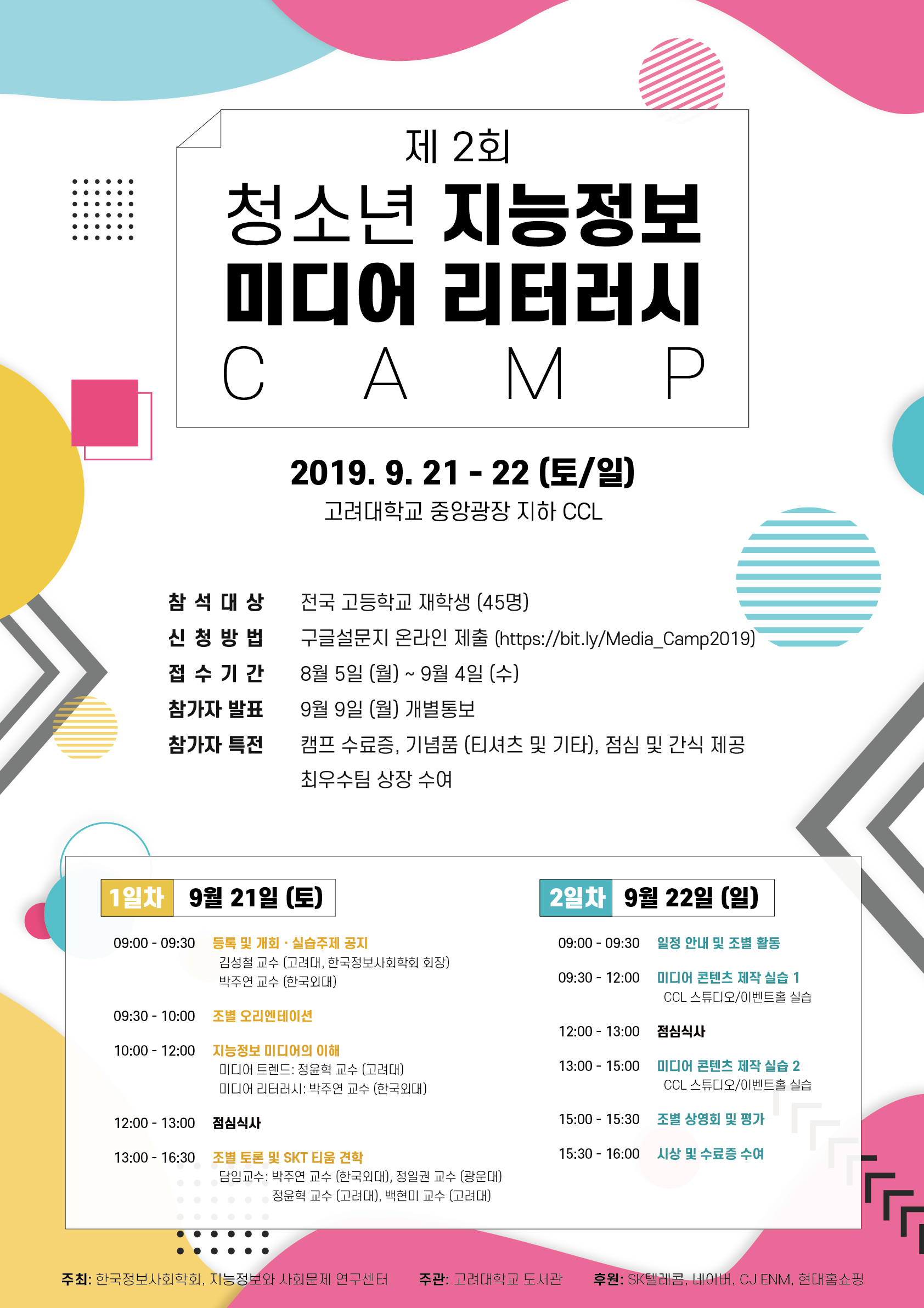 한국정보사회학회는 9월 21일(토)과 9월 22일(일) 이틀에 걸쳐 <제2회 청소년 지능정보 미디어 리터러시 캠프>를 다음과 같이 개최합니다. 회원님들의 많은 관심과 홍보 부탁드립니다.?