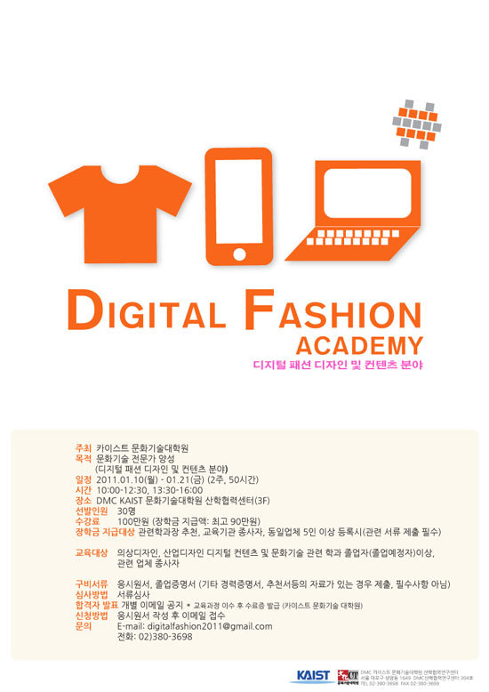 카이스트 문화기술대학원 DMC산학협력센터에서 2011년을 맞아 디지털패션 아카데미를 개최합니다. 오늘 날 패션산업과 디지털 기술의 융합으로 탄생한 디지털 패션은 학문 영역으로서뿐만 아니라 미래를 이끌어 갈 새로운 산업으로서 주목 받고 있습니다.
