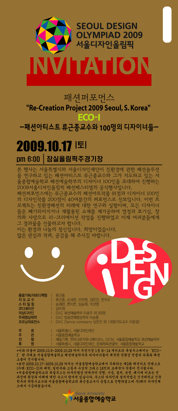 2009년 10월 17일 오후 6시~8시 잠실종합운동장 메인스타디움에서는 “ECO-I, 패션아티스트 류근종교수와 100디자이너스”란 제목의 패션쇼가 열린다.