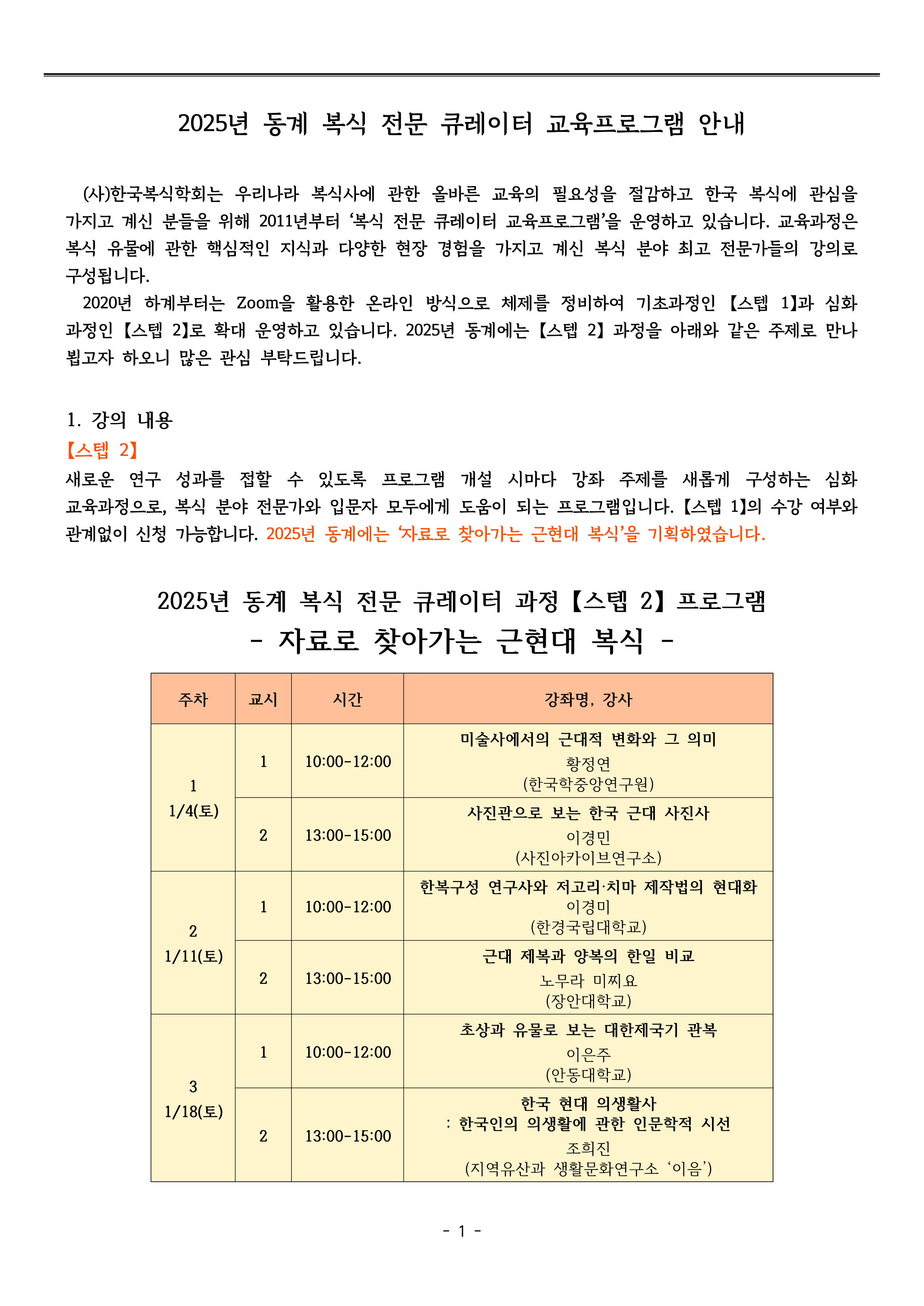 2025 동계 복식 전문 큐레이터 교육프로그램【스텝 2】 안내 - 신청: 12/5~1/1