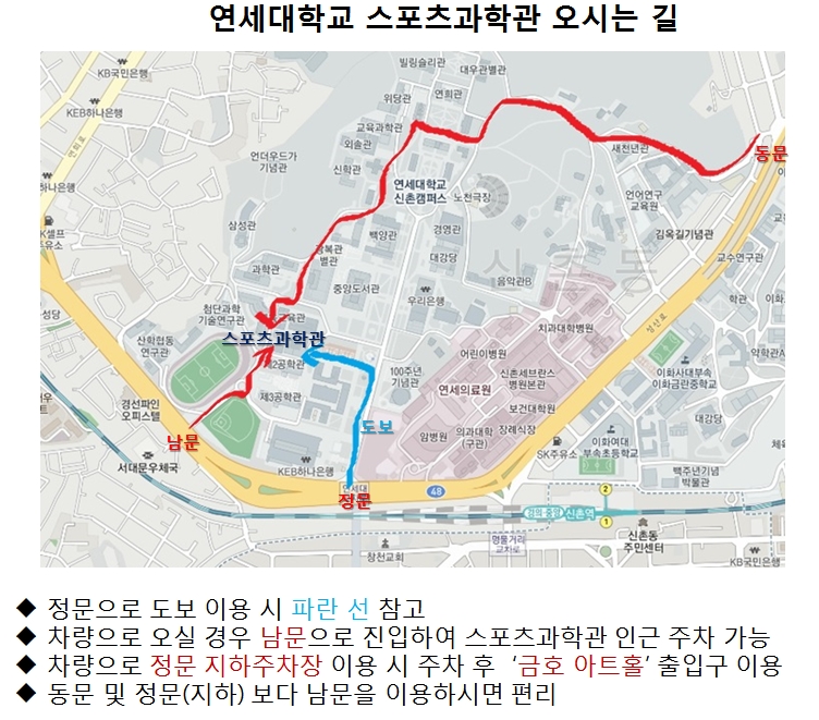* 차량으로 오실 경우 '연세대학교 남문'으로 들어오셔서 스포츠과학관 인근에 주차하시면 됩니다.