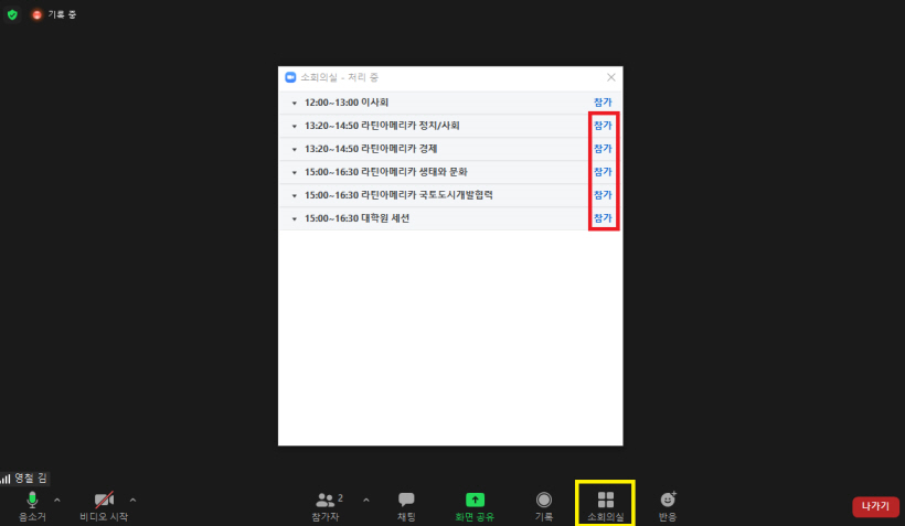 화면 하단의 [소회의실] 클릭 후 원하는 세션에 [참가]를 클릭하시면 해당 소회의실로 입장이 가능합니다.