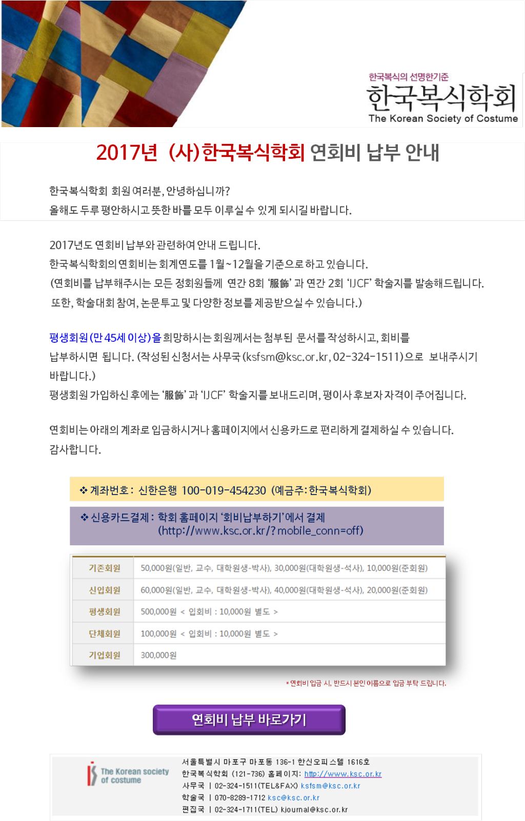(사)한국복식학회 2017년도 연회비 납부 안내