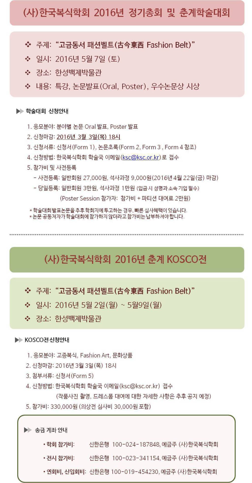 2016년 (사) 한국복식학회 정기총회 및 춘계학술대회, KOSCO전 개최 안내