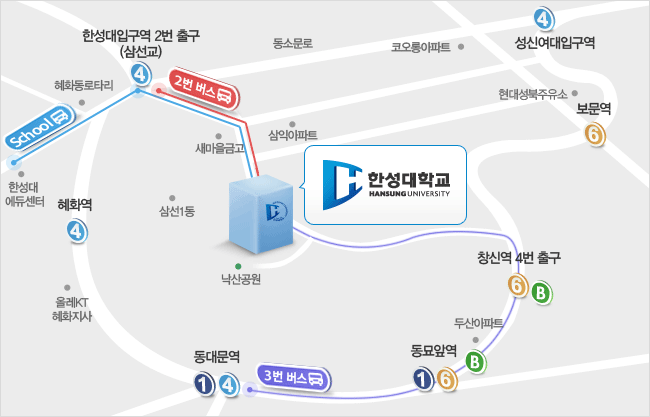 마을버스 : 4호선 한성대입구역 2번 출구 → 한성대학교행 02번 마을버스 이용(5분거리)