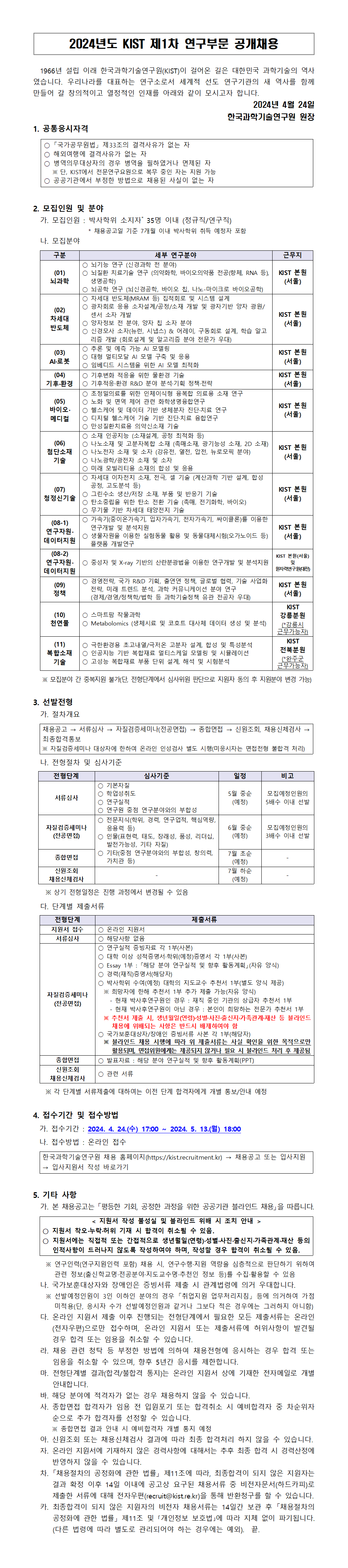 □ 2024년도 KIST 제1차 연구부문 공개채용