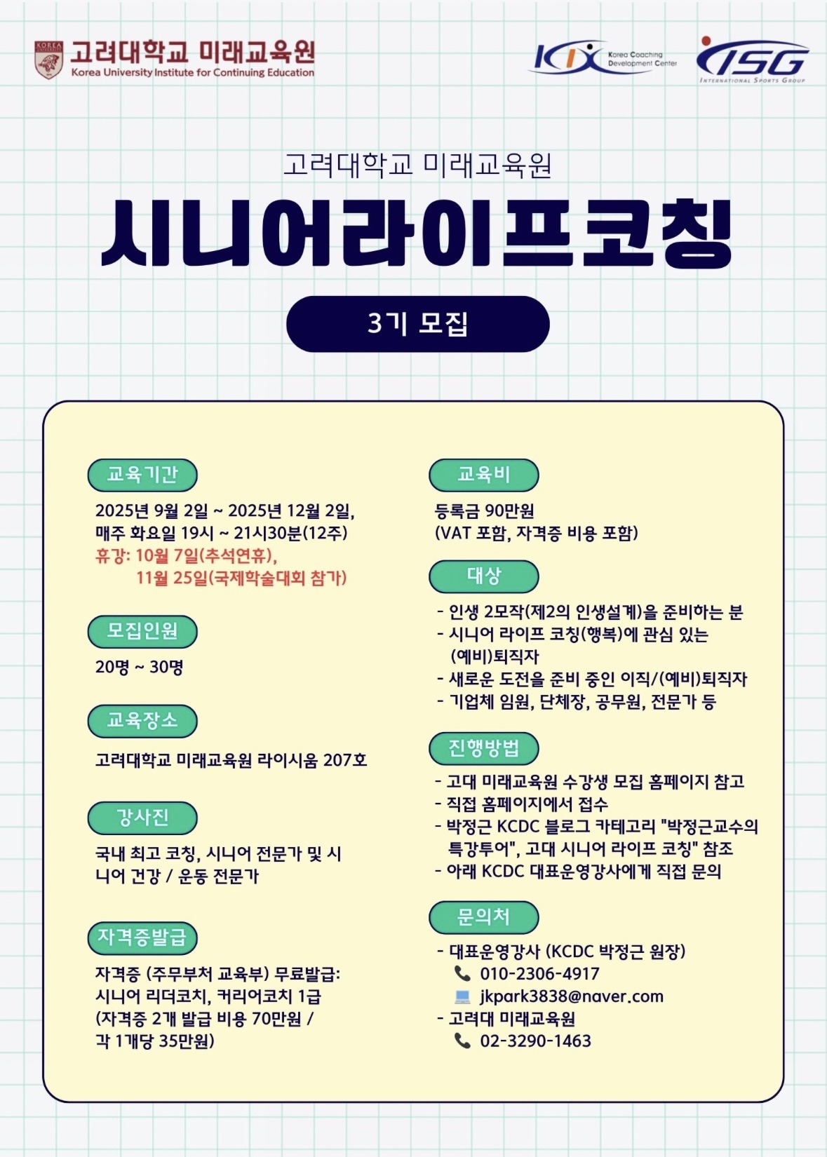 '시니어라이프코칭' 3기 모집(고려대학교 미래교육원, (사)한국코칭능력개발원)