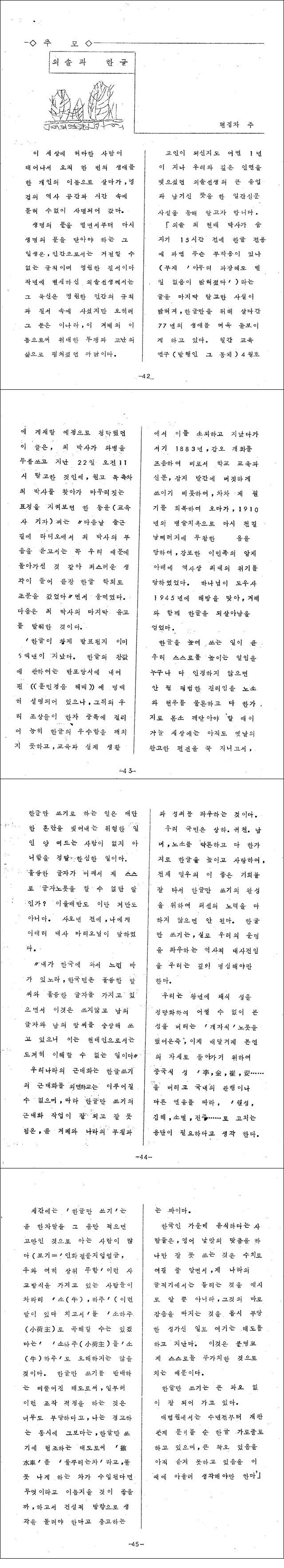 외솔 선생님 서거 15시간 전에 탈고하신 마지막 글입니다.