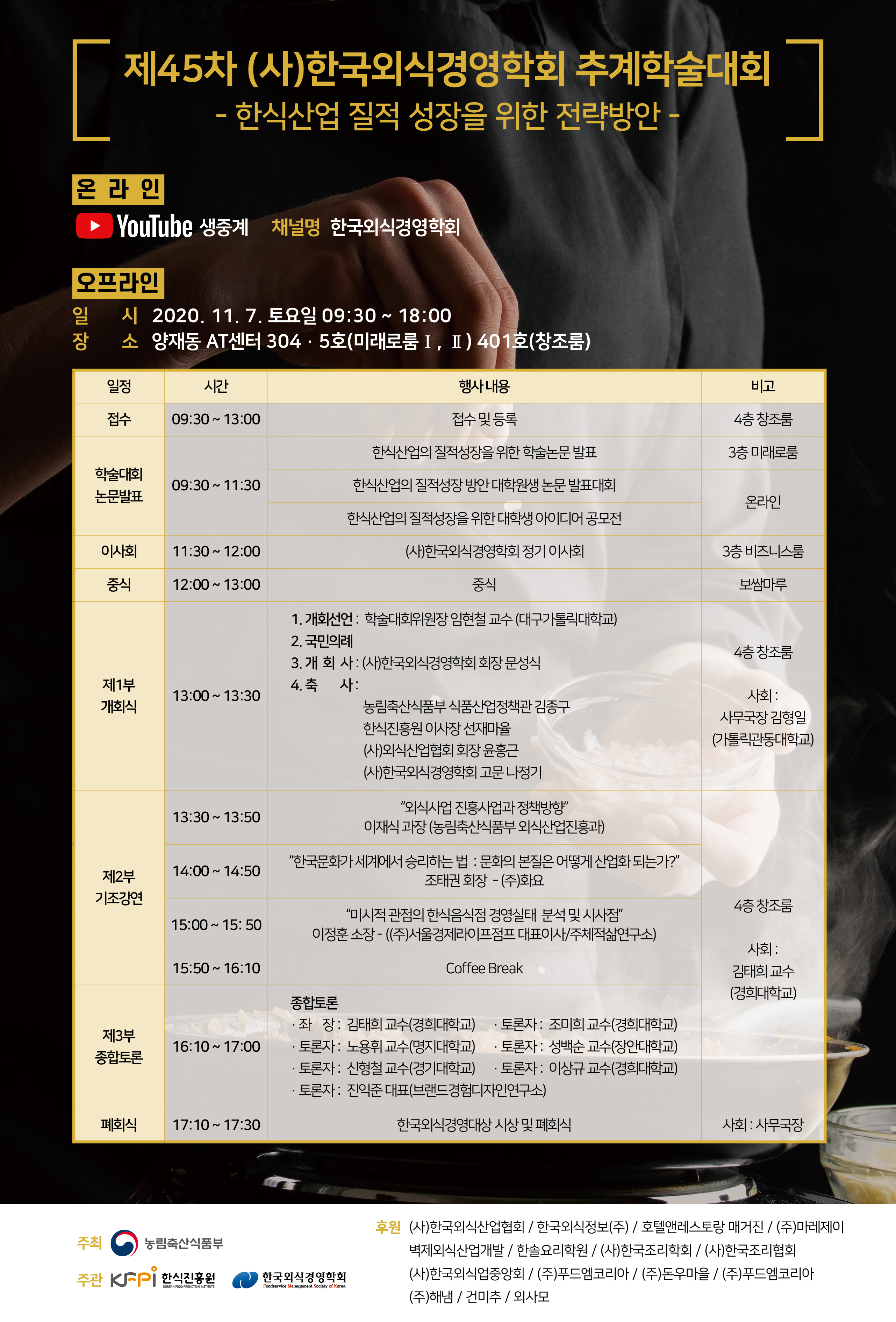 행사 당일 참석이 어려우신 회원분들께서는 학회 홈페이지 링크 또는 유튜브에서 ‘한국외식경영학회’를 검색하여 접속하시면 현장을 실시간 중계 방송을 보실 수 있습니다.