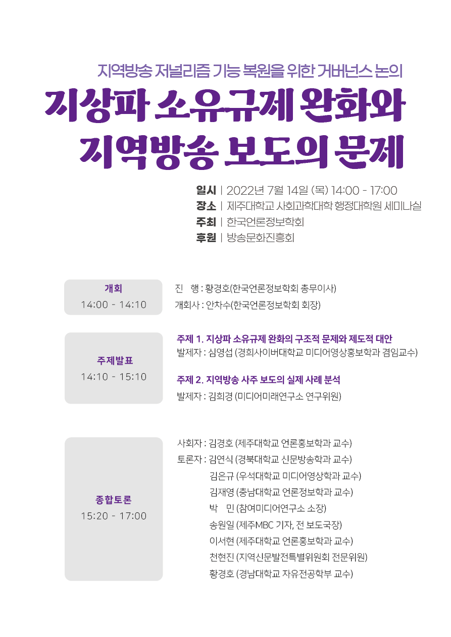 한국언론정보학회 학술세미나 <지역방송 저널리즘 기능 복원을 위한 거버넌스 논의: 지상파 소유규제 완화와 지역방송 보도의 문제> 개최 안내