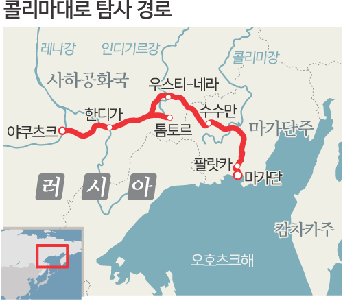 한국외국어대 러시아연구소의 콜리마대로 학술탐사팀은 7월 24일부터 8월 3일까지 한국해양수산개발원러시아 북동연방대와 공동으로 뼈 위의 도로를 자동차로 관통하면서 이 지역이 가진 역사적지리적 의미와 러시아연방 소수민족의 삶을 들여다봤다.
