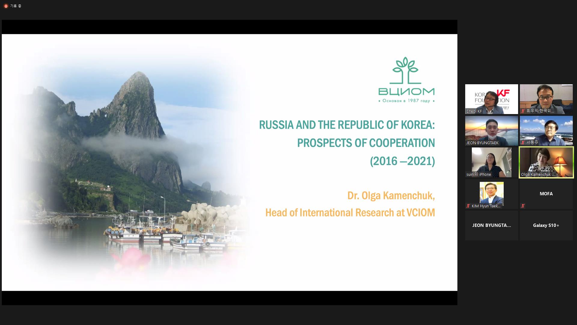 2021 년  6 월  1 일  21 시 러시아 국민의 한국에 대한 설문조사 결과 온라인 브리핑이 개최되었다 이 설문조사는 한국국제교류재단 (KF) 이 러시아 설문조사 기관인 프치옴 ( ВЦИОМ ) 과 한국외대 러시아연구소 ( 소장 표상용 ) 와 공동 시행한 것이다 이날 브리핑에서는 프치옴 선임연구원인 올가 카멘추크 ( Ольга Каменчук ) 와 러시아연구소 최우익 교수가 발표하였다 주요 발표 내용은 러시아 국민의 한국 및 한국 국민에 대한 인지도 수준 변화 한국의 관광 및 문화적 매력도 한러 수교  30 주년에 대한 인식 남북한 및 러시아 관계 인식에 대한 것이었다 카멘추크 연구원은 러시아 국민의 지난  5 년 동안 한국에 대한 관심이 커졌으며 인식도 긍정적으로 바뀌었고 특히 극동 지역 발전에 있어 한국의 중요성은 매우 높은 것으로 조사되었다고 언급했다 최우익 교수는 최근 러시아 국민 중 확고한 친한국 우호 집단의 비율이 좀 낮아졌으며 러시아 국민이 한국과의 협력 분야로 첨단 기술 분야보다도 의료 관광 민간교류를 더 꼽는 변화가 생겼음을 지적하였다 .