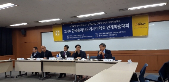 2018 11 23(러시아연구소는 본교 글로벌캠퍼스 국제사회교육원 연구동에서 한국슬라브·유라시아학회 공동으로 국내학술대회를 개최했다이번 학술대회는 크게 인문학 분과와 사회과학 분과로 나뉘어 진행됐다한국슬라브·유라시아학회 차기 회장인 김진영 교수가 '20세기 한국 사회와 러시아 문학사 기술의 역사'라는 주제로 인문학 분과의 회의를 시작했다인문학 분과의 2세션에서는 러시아연구소의 최우익 HK교수가 '러시아 북극 주민의 사회경제적 변화와 인식사하공화국 주민의 설문 조사 결과를 중심으로'라는 주제로 발표했으며이외 황성우김선래김혜진 교수가 다양한 발표의 사회와 토론으로 참여했다