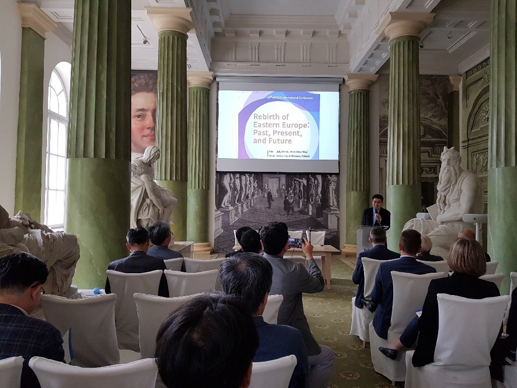 러시아연구소 소속 황성우 교수는 2018년 7월 4일(수)~5일(목) 이틀에 걸쳐 폴란드 바르샤바 국립대학교에서 개최된 국제학술회의에서 개회식 사회와 함께 논문을 발표했다. 바르샤바 대학교 역사연구소, 아시아중동부유럽학회, 한국외국어대 동유럽발칸연구소가 공동으로 개최한 이번 국제학술회의는 1918년 독립국가로 재탄생한 동유럽 제 국가를 100년이 지난 시점에서 다시 조명해보자는 취지로 기획됐다. 학술회의 주제는 ‘동유럽의 재탄생: 과거, 현재, 그리고 미래’(Rebirth of Eastern Europe: Past, Present, and Future)였다. 이번 국제학술회의에는 욜란타 호인스카-미카 바르샤바대학교 부총장, 바르토쉬 콘트이니 바르샤뱌 대학교 부학장, 루카쉬 니에시와프스키-스파노 역사연구소 소장 등 폴란드 측 인사들과 오성환 주 폴란드 공사, 김용덕 아시아중동부유럽학회장, 김정환 한국외국어대 동유럽대학장 등을 포함해 기조연설 포함 총 7개 세션에서 5개국 27명의 학자들이 발표했다.
