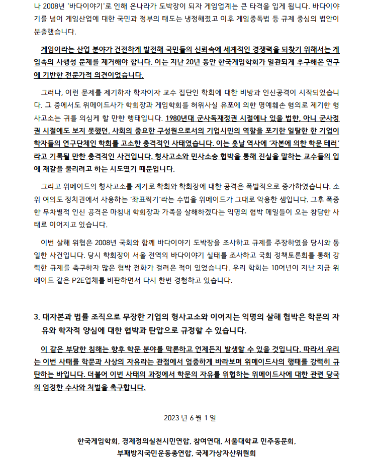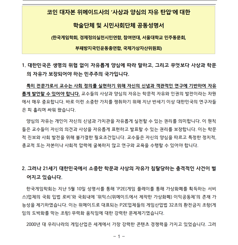 [한국게임학회] 코인 대자본 위메이드사의 ‘사상과 양심의 자유 탄압’에 대한 학술단체 및 시민사회단체 공동성명서