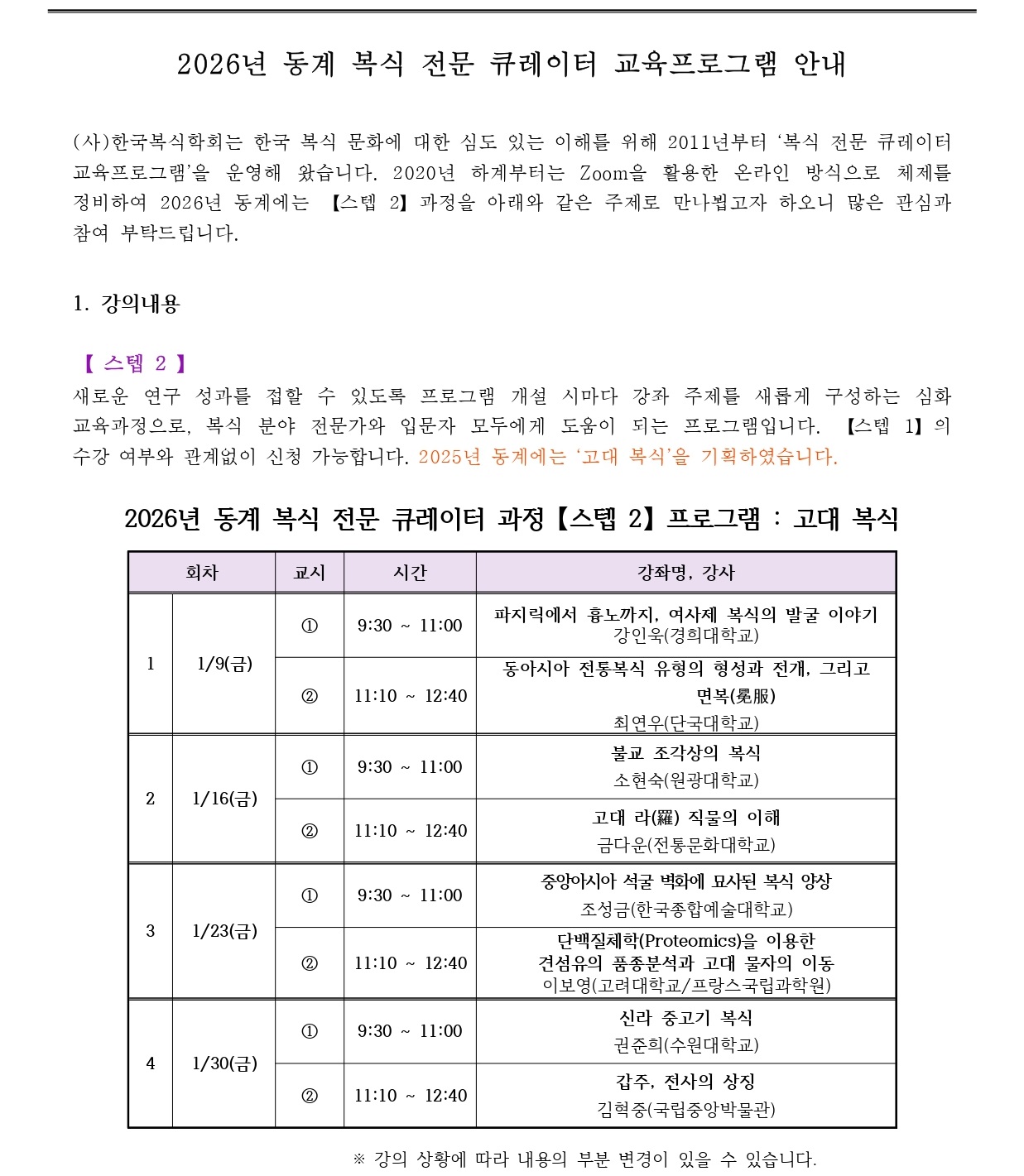 2026 동계 복식 전문 큐레이터 교육프로그램【스텝 2】 안내 - 신청: 12/1~12/30
