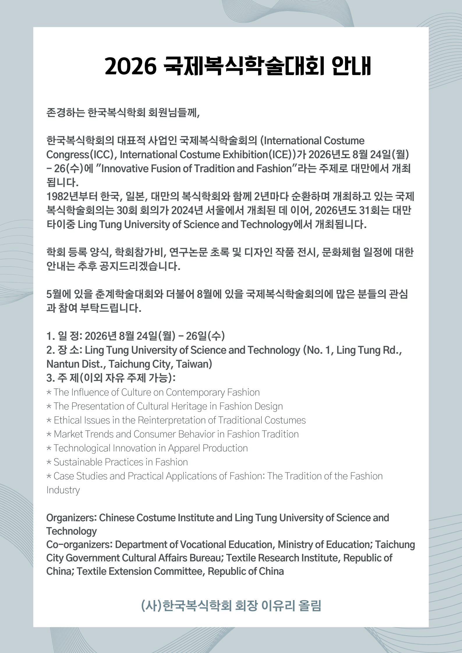 제 31회 국제복식학술대회(ICC) 일정 안내: 2026.8.24-26