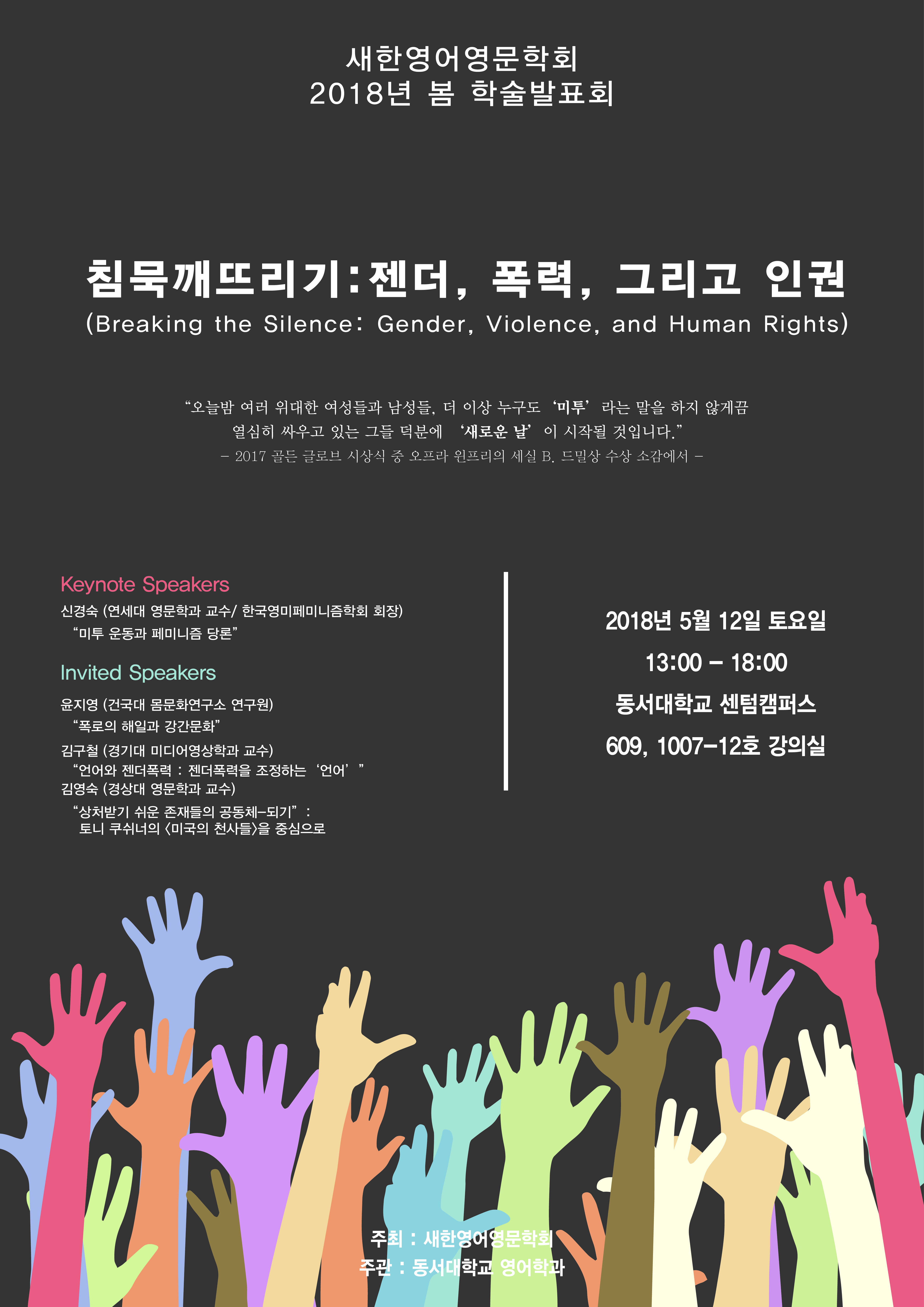 지난해 헐리우드에서 시작된 ‘미투’(Me Too) 운동이 우리나라를 비롯한 전 세계로 확산되면서, 많은 사람들은 해시태그를 붙여 ‘위드유’(#With you)로 응답하고 있습니다. ‘미투’ 운동이 사회의 여러 분야에서 관행으로 정당화되고 반복되어 온 성폭력과 성추행에 대해 ‘NO’라고 말하는 용기 있는 선언이라면, ‘위드유’ 운동의 확산은 소수의 외로운 투쟁이 가지는 한계를 넘어 침묵하는 다수의 변화와 참여를 촉구하고 있습니다. 이에 새한영어영문학회에서는 이번 봄학술대회를 통해 이 문제가 어떻게 사회적, 개인적 폭력, 젠더, 인권이라는 보다 광범위한 이슈와 얽혀있는지에 대해 토론할 수 있는 장을 마련하고자 합니다. 그 외에도 영어영문학 각 연구 분야의 주요발표가 마련되어 있사오니 많은 참석하셔서 학술발표대회를 빛내 주실 것을 간곡히 부탁드리는 바입니다.