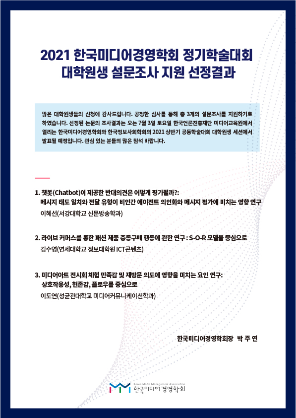 [학술대회] 2021 한국미디어경영학회 상반기 정기학술대회 대학원생 설문조사 지원 선정결과